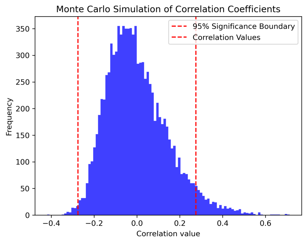 In the Python implementation, we ran 10,000 simulations, calculating the correlation between two randomly generated datasets for each simulation. The distribution of these correlation coefficients is plotted, and the 95th percentile is highlighted to indicate the range within which most correlation values lie. This range can be used to assess the significance of observed correlations in real datasets.