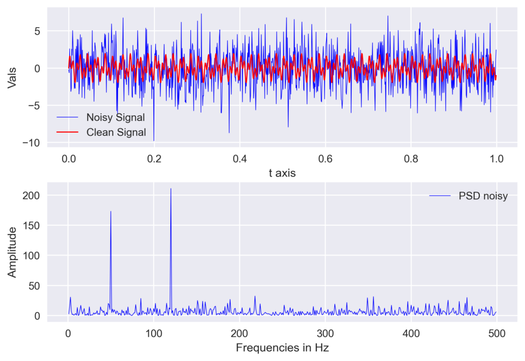 Numpy’s fft.fft function returns the one-dimensional discrete Fourier Transform with the efficient Fast Fourier Transform (FFT) algorithm. The output of the function is complex and we multiplied it with its conjugate to obtain the power spectrum of the noisy signal. We created the array of frequencies using the sampling interval (dt) and the number of samples (n).